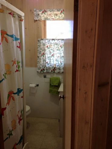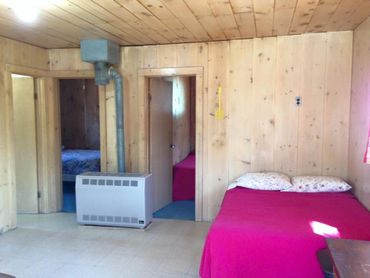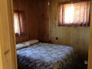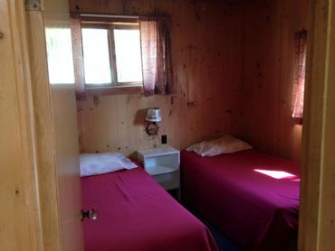 This is our largest, and newest cabin. It has 2 bedrooms and sleeps 8 with 1 queen, 1 double, 3 twin beds and a pull out couch. Larger handi-capped accessible living area, bathroom , and deck. (5 person min.)